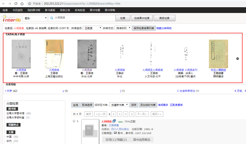 云南大学图书馆馆藏书目检索系统OPAC已经集成了CADAL的电子资源接口,读者使用OPAC检索图书,如果该图书的扫描版电子书在CADAL上已经存在,在OPAC的检索结果页面的上面就会显示CADAL中相关电子资源的图书列表。如图1所示:
